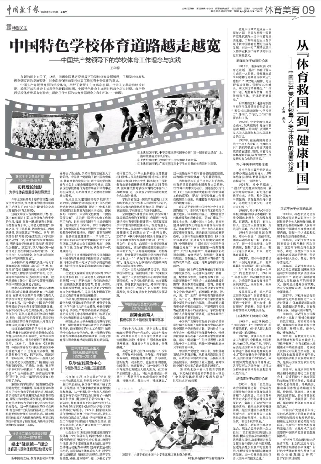 文章的刊发缘于20213月王雁老师在《体育与科学》(CSSCI2021年第二期发表学术论文《党的五代领导人关于体育的重要论述蕴含的马克思主义哲学观》,截至目前在中国知网下载量达548次,动商研究院、全国马院日报(中央编译出版社资讯)等平台进行了转载。中国教育报主动联系王雁老师撰写刊发本文。