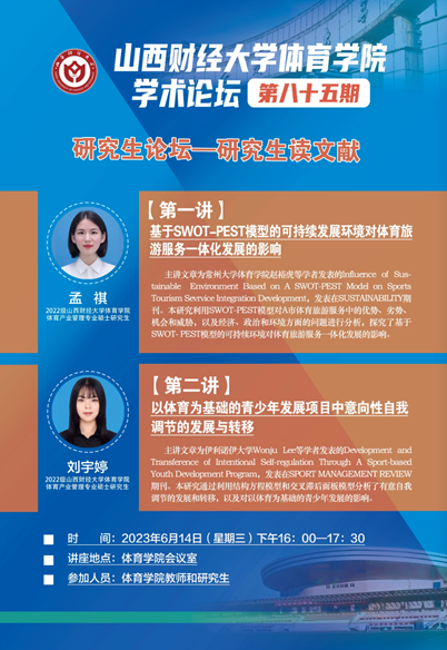 614日下午,途游斗地主下载 学术论坛第八十五期研究生论坛——研究生读文献在途游斗地主 会议室举办。2022级体育产业管理专业硕士研究生孟祺和刘宇婷两位同学进行文献精讲,途游斗地主下载 全体研究生及途游斗地主 部分教师参加研讨,途游斗地主 学科和研究生办公室主任王雁副教授主持论坛。