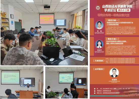 9月26日上午,途游斗地主 学术论坛第九十三期——研究生读文献在途游斗地主 会议室举办。此次论坛由体育产业管理专业硕士研究生2023级李佳宇和2021级李璐两位同学进行文献精讲,2022级刘宇婷、2023级关妮与2021级张逸杰、丁亦龙四位同学做文献速递。途游斗地主 教师张新英、刘铮,青年博士教师许磊、胡荣光、薛鹏飞及全体研究生通过线上与线下相结合的方式参与研讨交流。途游斗地主下载 青年教师、哈尔滨途游斗地主 在读博士研究生张建辉担任本期论坛点评嘉宾,途游斗地主 学科和研究生办公室主任王雁副教授主持论坛。