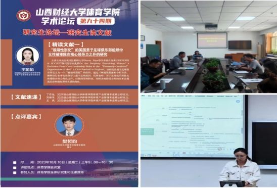 10月10日上午,途游斗地主 学术论坛第九十四期研究生论坛——研究生读文献在途游斗地主 会议室举办。本次论坛由2022级体育产业管理专业硕士研究生王聪聪同学进行文献精讲,21级丁亦龙、2023级刘德宇和2022级王爽三位同学做文献速递。途游斗地主 教师杨海涛、吕栋和常垒,青年博士教师许磊以及全体研究生通过线上与线下相结合的方式参与研讨与交流。本次论坛特邀途游斗地主下载 青年教师樊哲昀博士担任点评嘉宾,并在途游斗地主 学科和研究生办公室主任王雁副教授的主持下圆满结束。