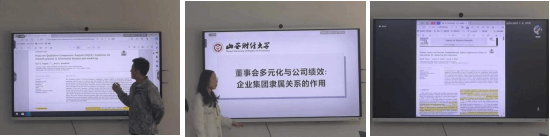 王聪聪同学结合最近关注的研究领域选取了文献《董事会多元化与公司绩效:企业集团隶属关系的作用》做分享。她根据文献内容结合自己的研究经验,总结出了在指标选择过程中对变异系数或者被解释变量的选择,可以得到可获得性及是否与论文内容的契合程度等创新点和研究思路的新启示。