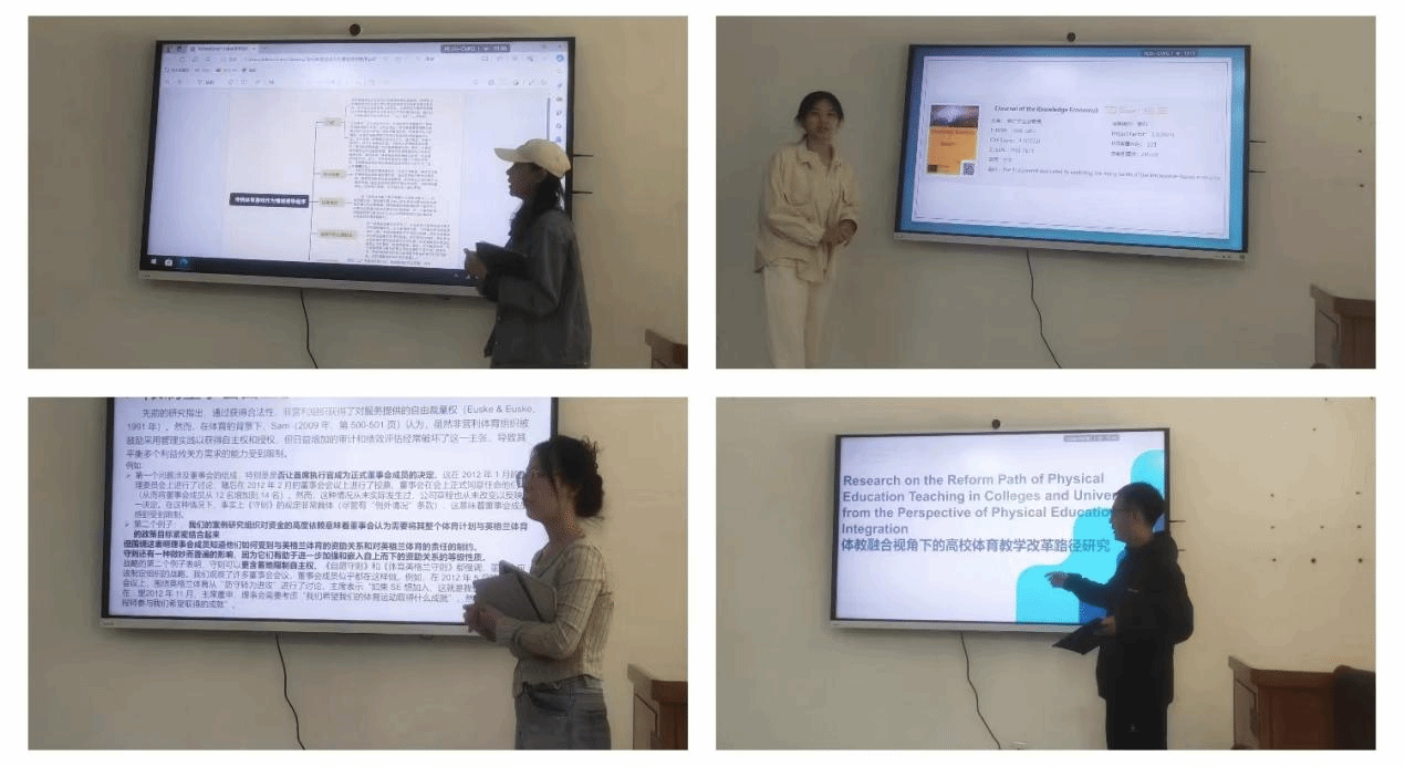 在文献速递的环节里,杨子仪同学选取主题为“传统体育游戏作为情绪诱导程序”,这是一个比较有趣的主题和研究方向,丰富了大家对体育研究的范畴和视野。付芳芳同学对“非营利组织的效率:支持战略决策的DEA分析”进行阐述,本研究对高校体育俱乐部在5个赛季的运作效率进行了分析,效率分析运用DEA方法进行,并结合半结构化互访进行定性分析,最终确定俱乐部采用的组织结构和效率水平结果之间的现有关系。王爽同学就文章《非营利组织治理的“法典化”英国体育产业发展现状》展开论述,该研究旨在通过一个广泛的制度框架和对合法性概念的关注探讨董事会层面缺乏理解的问题,并对英国非营利体育部门法规的深入分析来解决该问题。刘德宇同学基于国家政策的提出并结合个人兴趣的偏好,选取“Research on the Reform Path of Physical Education Teaching in Colleges and Universities from the Perspective of Physical Education Integration”进行分享,简明阐述了在体教融合视角下高效体育教学改革路径的相关研究。