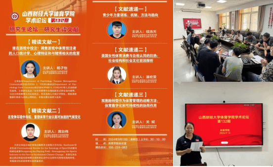 9月13日上午,途游斗地主 第一百三十二期学术论坛——研究生读文献在途游斗地主 会议室举办。2023级体育产业管理专业硕士研究生杨子仪、席壮伟两位同学做了文献精讲,2022级续浩天、2022级潘宏雯、2023级关妮三位同学随后带来了文献速递。体育经济与管理教研室主任张新英老师主持论坛,途游斗地主 全体研究生共同参与研讨交流。