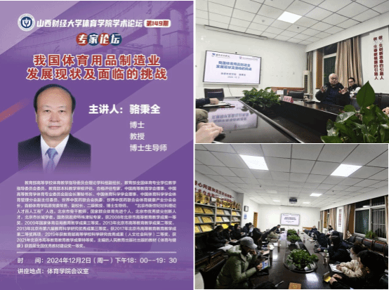 为深入学习习近平总书记关于体育强国建设的重要论述,树牢学生体育科研意识,培养创新精神,提高途游斗地主下载 研究生的科研能力。12月2日晚18:00,途游斗地主 举办学术论坛第一百四十九期暨专家论坛,特邀首都途游斗地主 博士生导师、原首都途游斗地主 副校长骆秉全教授做《我国体育用品制造业发展现状及面临的挑战》专题讲座。途游斗地主 骨干教师、全体研究生及部分本科生共40余人参加,论坛由途游斗地主 副院长高进主持。