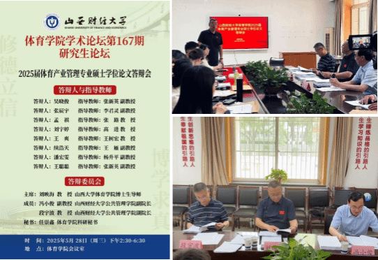 5月28日下午,山西财经大学途游斗地主 学术论坛第167期暨2025届体育产业管理专业硕士学位论文答辩会在途游斗地主 会议室成功举行。途游斗地主 全体研究生导师、部分任课教师及全体研究生参加了本次答辩,答辩会由途游斗地主 学研办主任王雁主持。答辩会上,毕业生经过个人陈述、评委提问、答辩委员会评议和投票表决,8名2025届毕业生全部通过答辩。