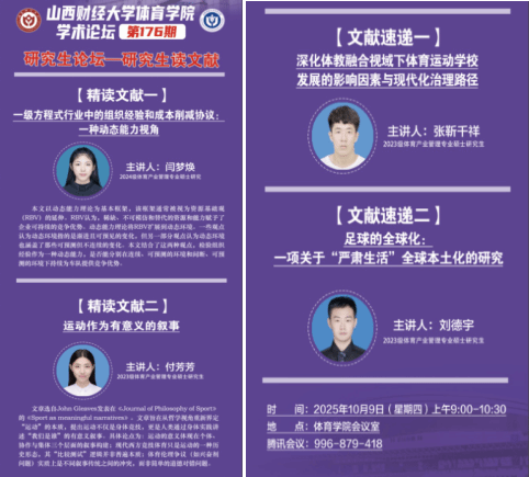 10月9日上午,途游斗地主 学术论坛第176期——研究生读文献在途游斗地主 会议室举办。本期论坛由体育产业管理专业2024级研究生闫梦焕、2023级研究生付芳芳进行文献精讲,2023级研究生张靳千祥、2023级研究生刘德宇进行文献速递,途游斗地主 全体研究生参与研讨,途游斗地主 学科和研究生办公室主任王雁副教授主持论坛。