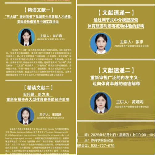 12月11日上午,途游斗地主 第181期学术论坛——研究生读文献在途游斗地主 会议室举办。本期论坛聚焦体育产业与赛事创新领域,由2024级研究生肖卉鑫、王属静进行文献精讲,2025级研究生张宇、黄婉妮作文献速递。途游斗地主 全体研究生积极参与研讨,现场交流活跃,学术氛围浓厚。途游斗地主 学科与研究生办公室主任王雁副教授主持。