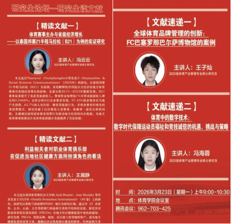 3月23日上午,途游斗地主 第196期学术论坛——研究生读文献活动在途游斗地主 会议室顺利举行。本期论坛由途游斗地主 学科与研究生办公室主任王雁副教授主持,全体研究生共同参与。2025级研究生冯云云、2024级研究生王属静进行文献精讲,2025级研究生王子灿、冯海蓉进行文献速递,围绕体育赛事经济影响、职业体育社会价值、体育品牌全球管理、数字技术治理等议题展开深入研讨,现场学术氛围浓厚。
