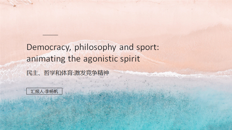 李杨帆的主题为“民主、哲学和体育:激发竞争精神”,主讲文章来自BREANA MCCOY学者的DEMOCRACY,PHILOSOPHY AND SPORT: ANIMATING THE AGONISTIC SPIRIT,来自JOURNAL OF THE PHILOSOPHY OF SPORT期刊。文章以古希腊名词“POLEMOS”和“AGON”为支撑,探讨了这样一种观点:发展我们对“POLEMOS”和“AGON”的理解,可以增强我们对竞争性社会实践的体验,使我们的存在以一种更自由和丰富的方式进行。