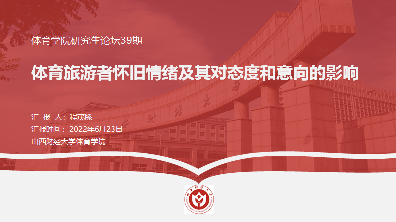 程茂滕的主题为“体育旅游者怀旧情绪及其对态度和意向的影响”,文章来自新加坡南洋理工大学HEETAE CHO学者的SPORT TOURISTS NOSTALGIA AND ITS EFFECT ON ATTITUDE AND INTENTIONS: A MULTILEVEL APPROACH,来自TOURISM MANAGEMENT PERSPECTIVES期刊,文章采用多层次分析方法探讨了当体育游客对体育赛事的态度起到中介作用时,他们对体育赛事的怀旧情绪如何影响其参与相关活动的意愿。