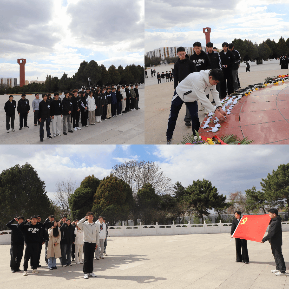 烈士陵园内松柏凝翠,氛围庄严肃穆,巍峨的烈士纪念碑在苍松翠柏的掩映下更显庄严。全体学生怀着无比崇敬的心情,整齐列队站立在太原解放纪念碑前,向为民族解放、人民幸福英勇献身的革命先烈郑重默哀,深深鞠躬表达敬意。大家饱含着对革命先辈的追思与缅怀,缓步绕碑一周,瞻仰英烈丰碑,庄重敬献花束,寄托对无数英烈的深切悼念和崇高敬意。随后,全体学生党员面向党旗,高举右拳,重温入党誓词,铿锵誓言彰显不忘初心、牢记使命的坚定信念。