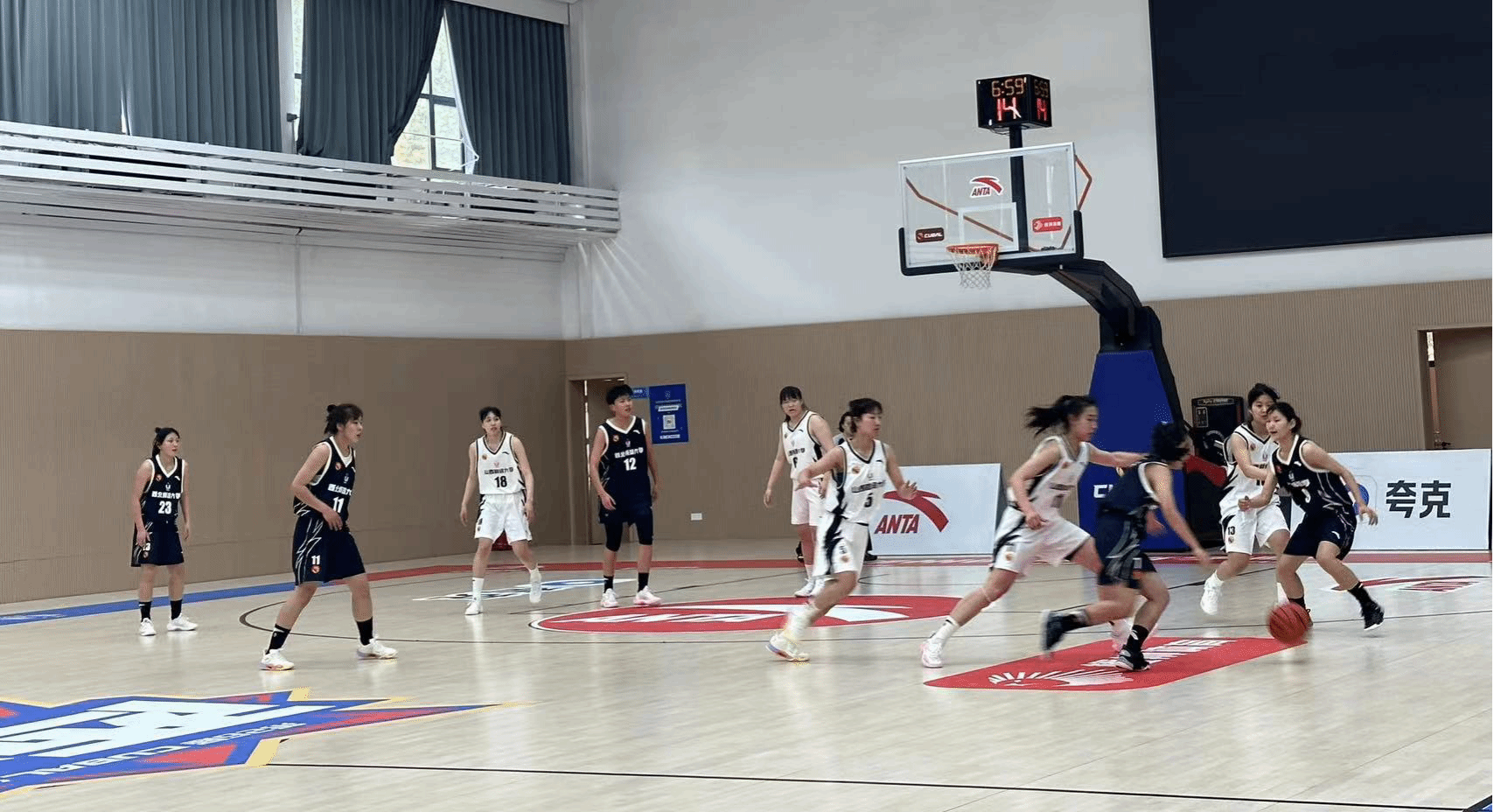 女篮首节比赛,双方以试探为主,队员进入状态较慢,比分胶着。首节比赛结束,我校女篮以15:12领先西北师范大学。进入第二节,队长卢诗怡强攻篮下取得两分,吹响了我校女篮进攻的号角,通过加强防守,内突外投,逐渐拉开了比分差距。末段孙晓涵连续命中两分,帮助我校女篮以37:17领先对手进入下半场。下半场易边再战,我校女篮全面开花,陈张妍犀利的突破,张子悦的外线精准三分,孙晓涵的中投,卢诗怡的篮下强攻,显示了我校女篮的训练有素。最终,经过团队配合,一鼓作气,不骄不躁,取得整场比赛的胜利!