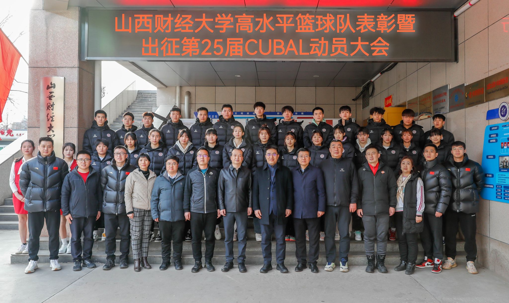 田祥宇代表校党委、校行政,向高水平篮球队教练员和运动员的辛勤付出表示诚挚慰问,并对取得的突出成绩表示衷心祝贺。他指出,我校高水平篮球队自1998年建队起,历经25年的发展,一路披荆斩棘,屡创佳绩,为我校篮球运动的发展、竞技体育的建设、校园体育文化的营造,以及提高财大社会声誉,做出了重要贡献。出征之前,他向高水平篮球队提出了三点要求:一是自省自律,安全出行。请大家务必听从指挥,统一行动,慎独慎微、慎始慎终,确保全程安全健康。二是顽强拼搏,团结协作。大力弘扬体育精神,敢打敢拼、奋勇争先,既要发挥自己的优势,更要服从大局合力战斗,打出财大人的风貌、打出财大人的气势、打出财大人的精神。三是不负使命,力创佳绩。要将校党委、校行政和全体师生的期盼,转化为拼搏的勇气和奋战的动力,不畏艰险、不惧强敌,拿出自己最佳的状态和最强的战力,努力在山西财大高水平篮球队的历史上再书写出绚丽的一笔。