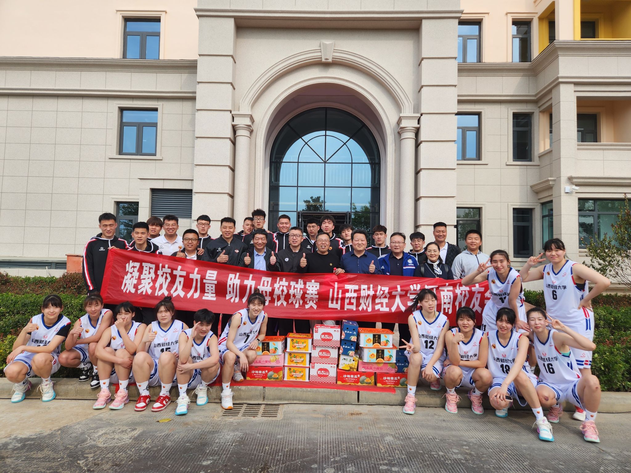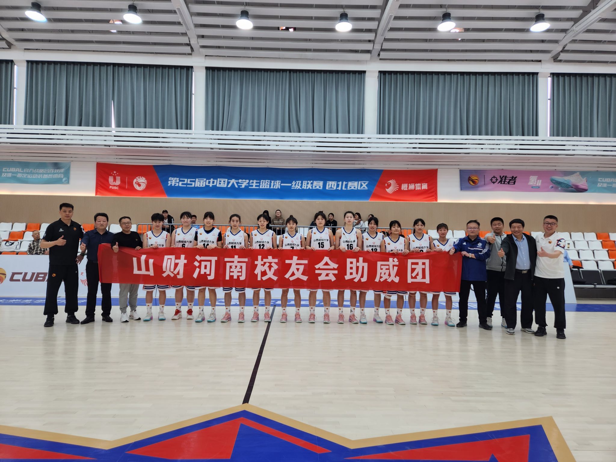4月2日,CUBAL西北赛区比赛第三日,山西财经大学男篮、女篮各有一场比赛,赛前教练组认真分析对手数据、布置比赛阵型和战术、组织队员们做好热身训练。山西财经大学河南校友会孙亦舒会长、刘海亮秘书长、新郑市交通运输局赵金聚局长、济源市海关欧阳亮元关长、河南中烟黄金叶生产制造中心王广民等校友及校友家属,到场为队员们助威喝彩,并为队员赠送慰问品。