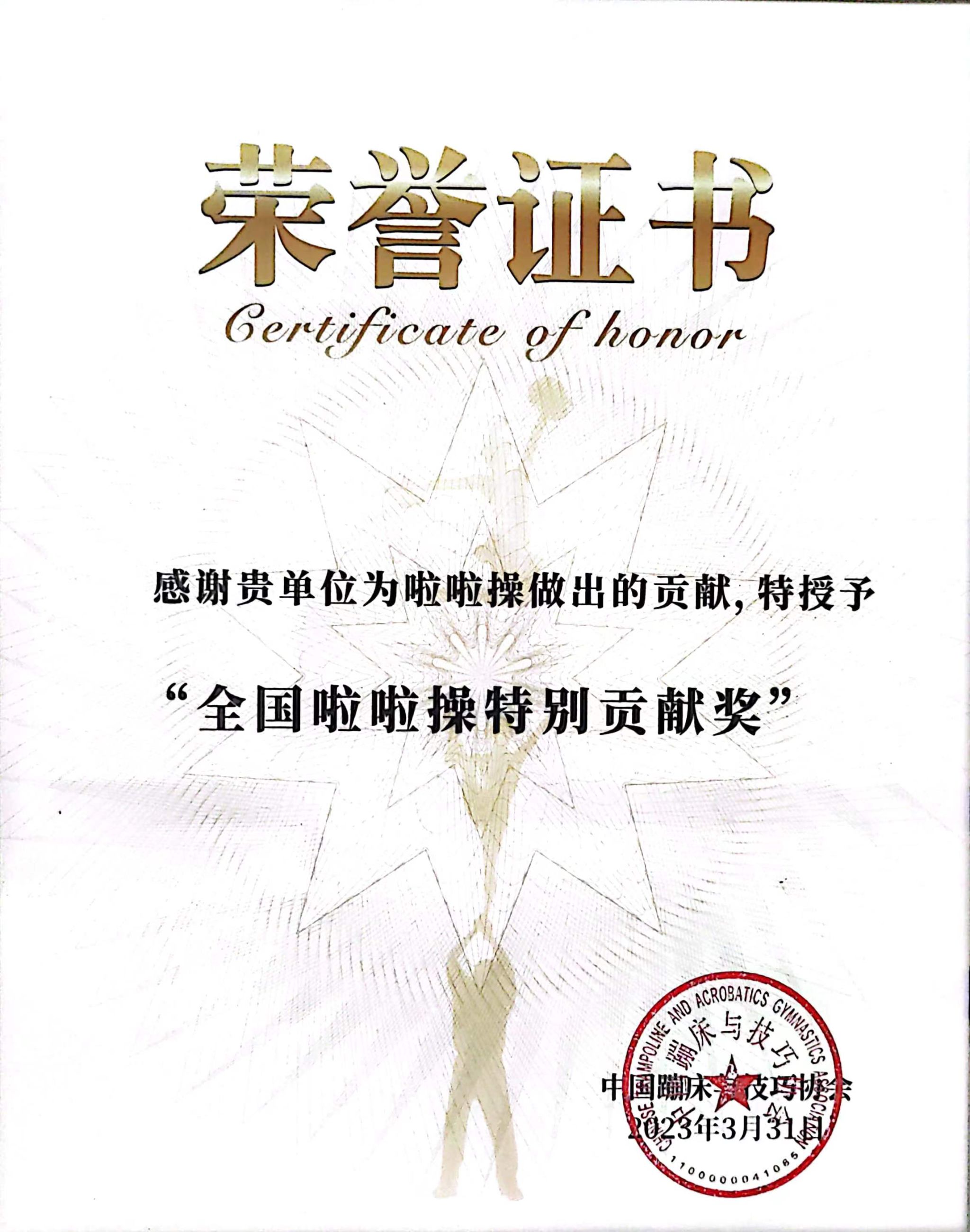 3月31日,第五届中国啦啦操文化纪在海南儋州海花岛国际会展中心开幕,来自全国两千余名校长、教育局局长、体育局局长及啦啦操教师共襄盛典,欢聚一堂。此次活动由国家体育总局体操运动管理中心、中国蹦床与技巧协会主办。我校荣获“全国啦啦操特别贡献奖”。