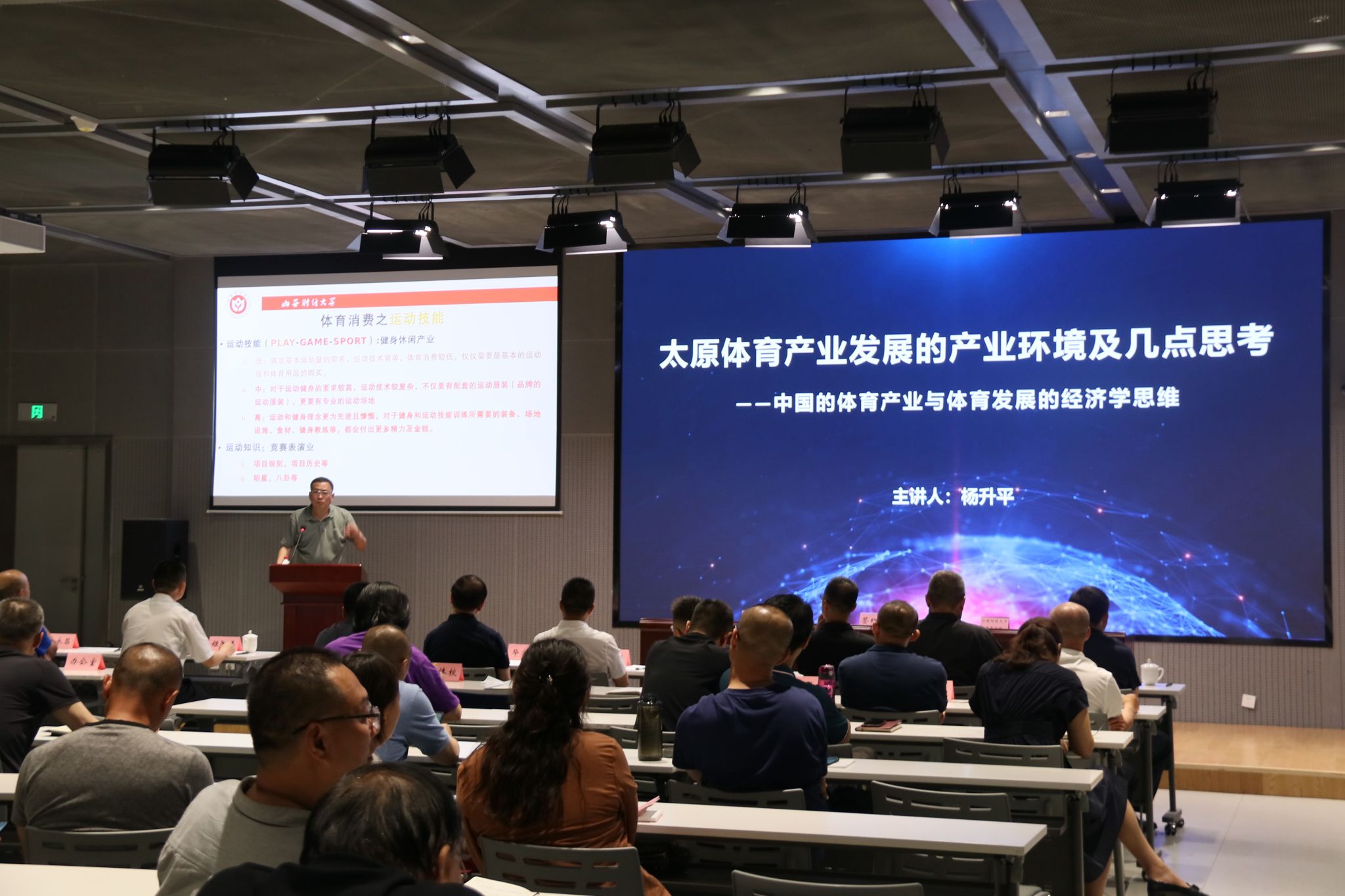 签约仪式后,杨升平博士作了题为《太原体育产业发展的产业环境及几点思考——中国的体育产业与体育发展的经济学思维》的专题讲座。从分析中国体育产业发展现状出发,通过探讨上海市和成都市的运动城市计划为太原体育产业高质量发展提供案例参考。同时,从体育发展的经济学思维视角,阐述了微观消费者、中观产业、宏观政策对体育产业发展影响的逻辑关系。