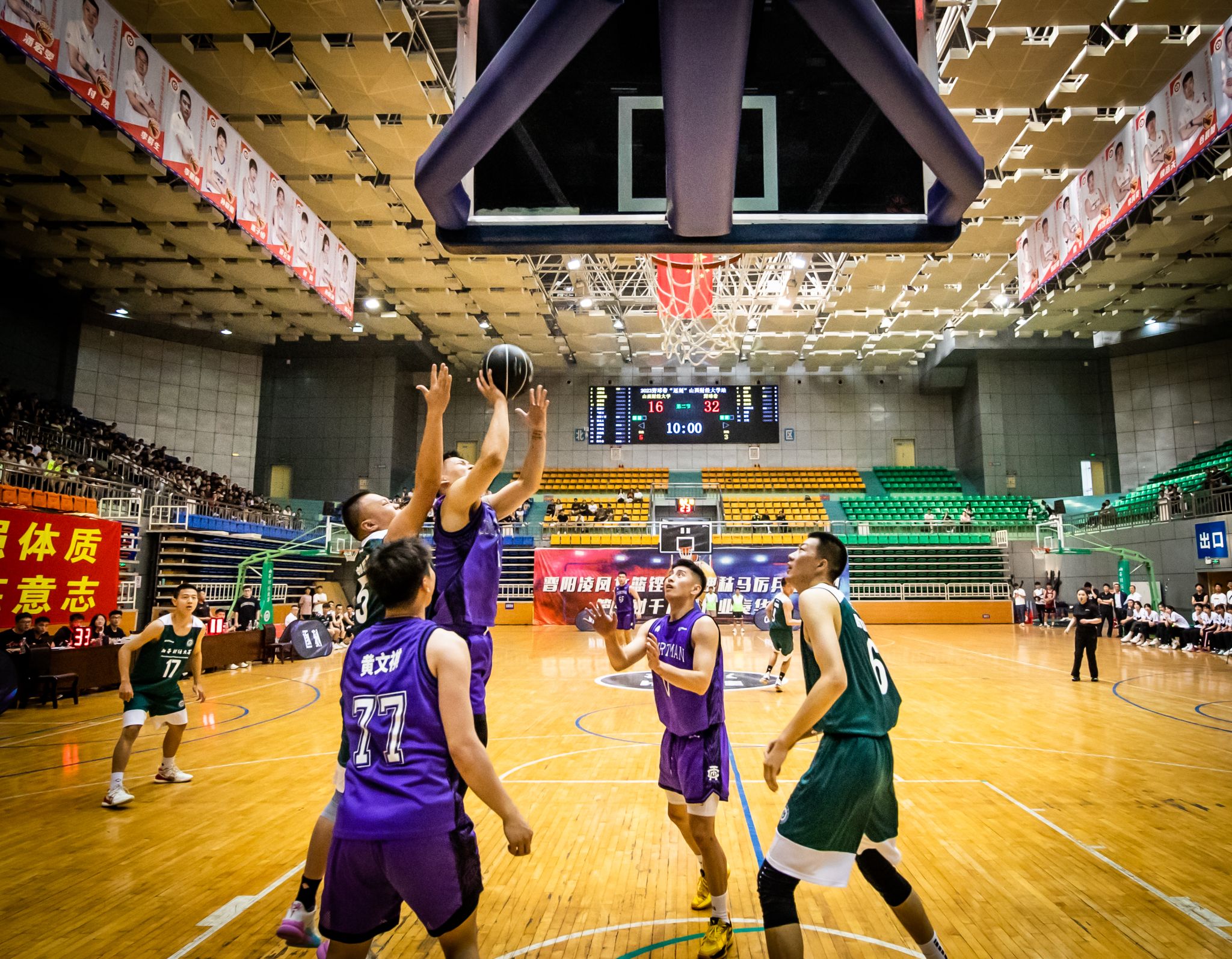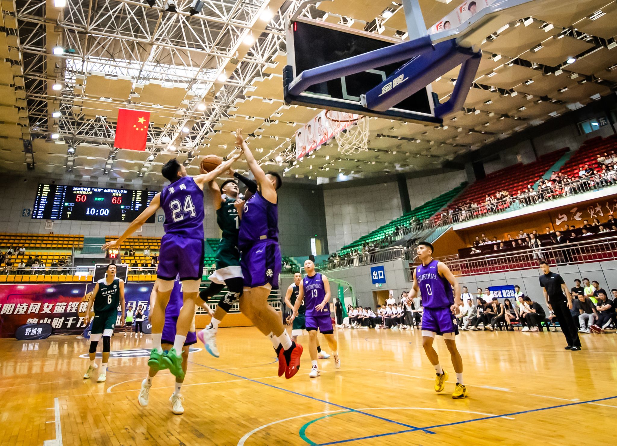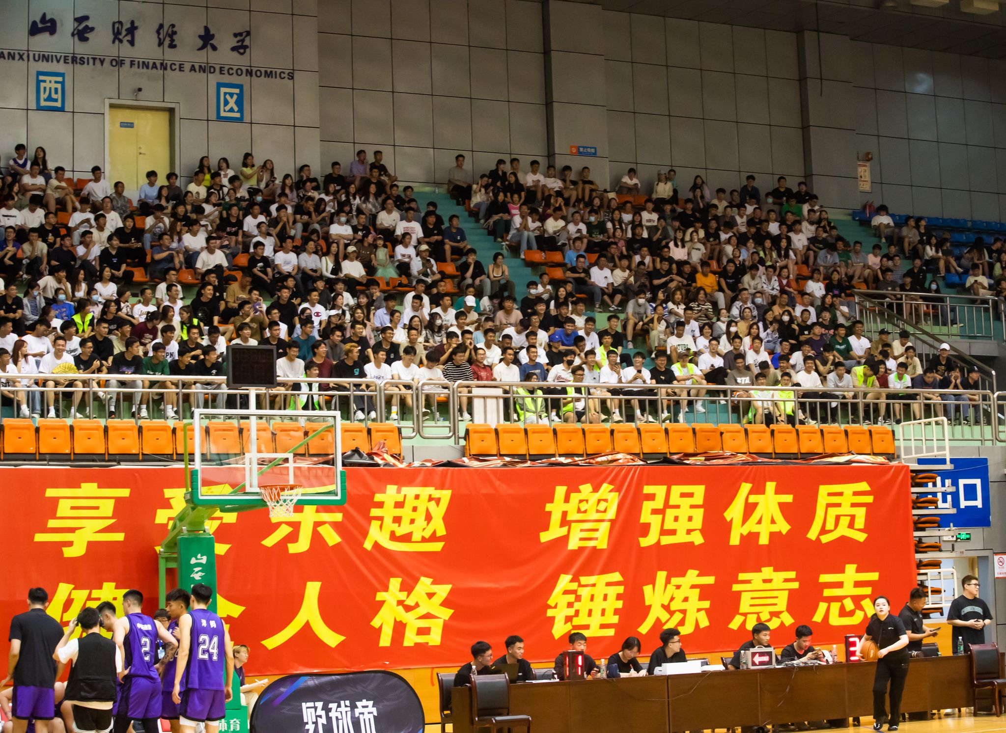 第二节开始,山西财经大学篮球队调整战术,沉着应战,积极寻找自己的节奏,队员们分散站位,在对方队员周围观察,不错过每一个抢球的机会,在对方的猛烈攻势中寻找机会。双方都在全力以赴,场外观众掌声不断,欢呼不止。