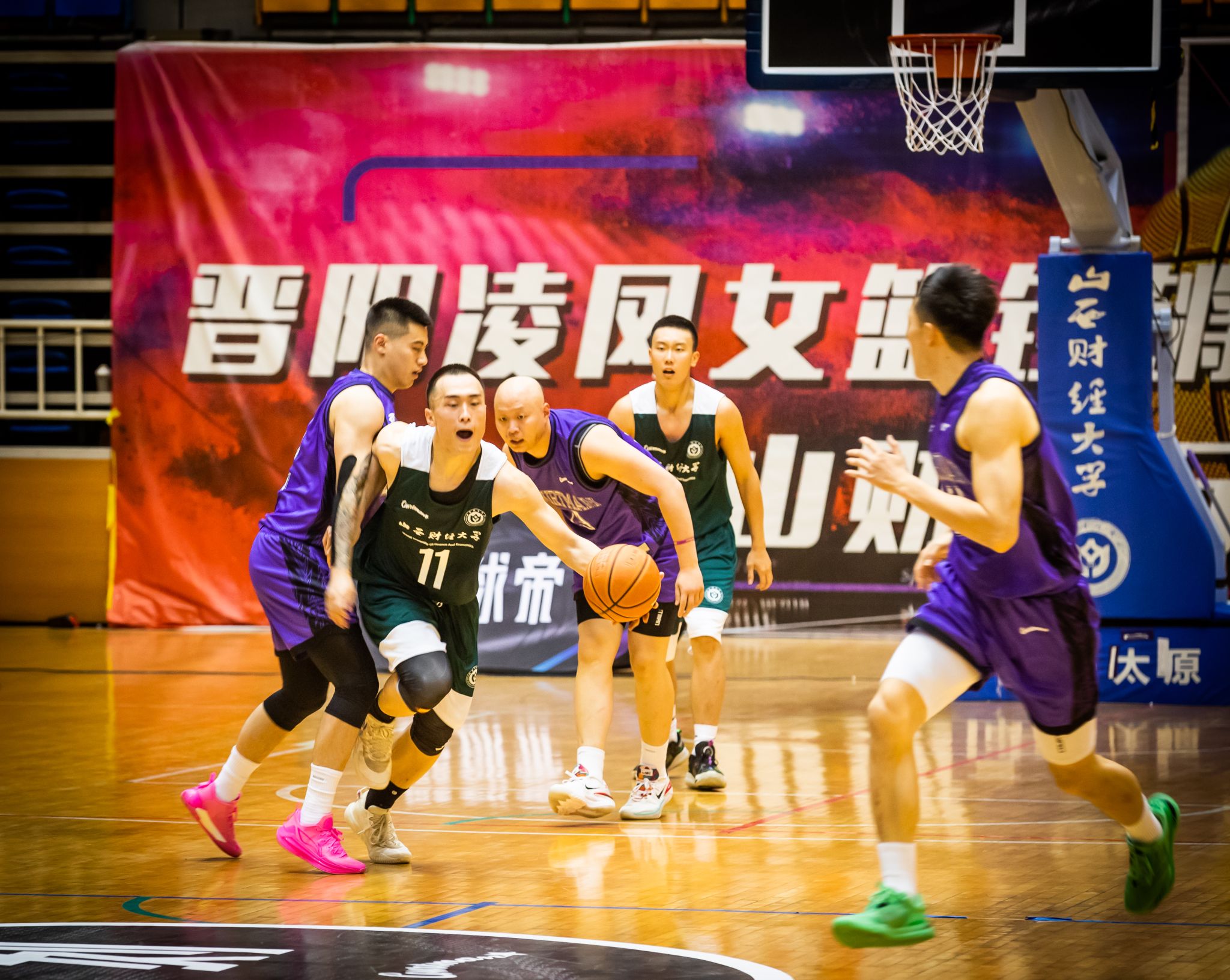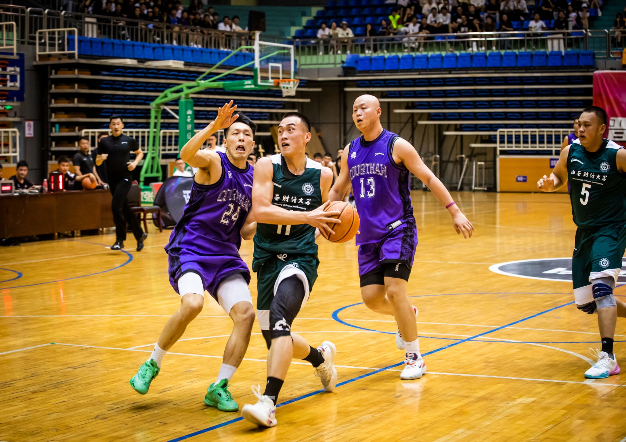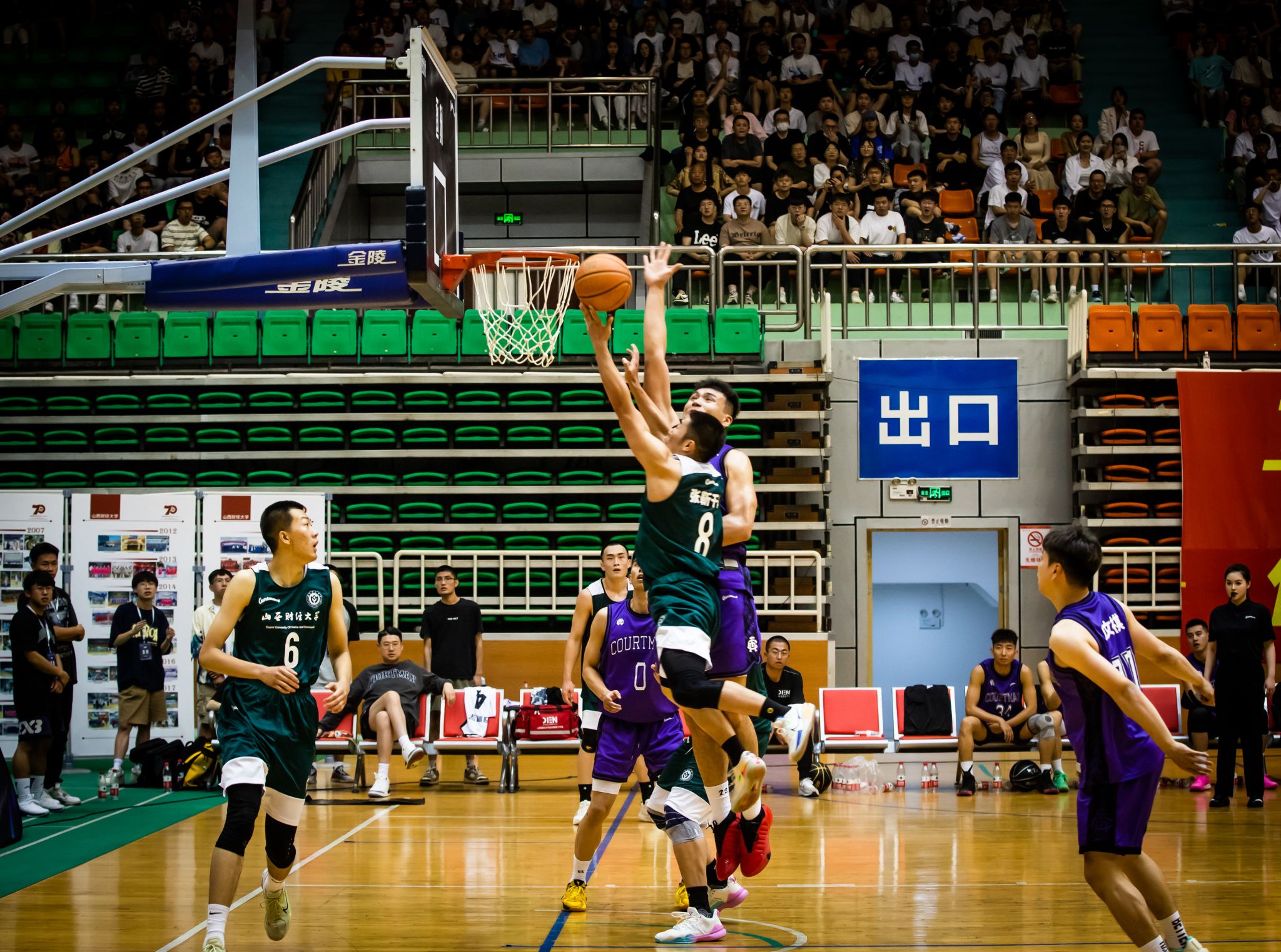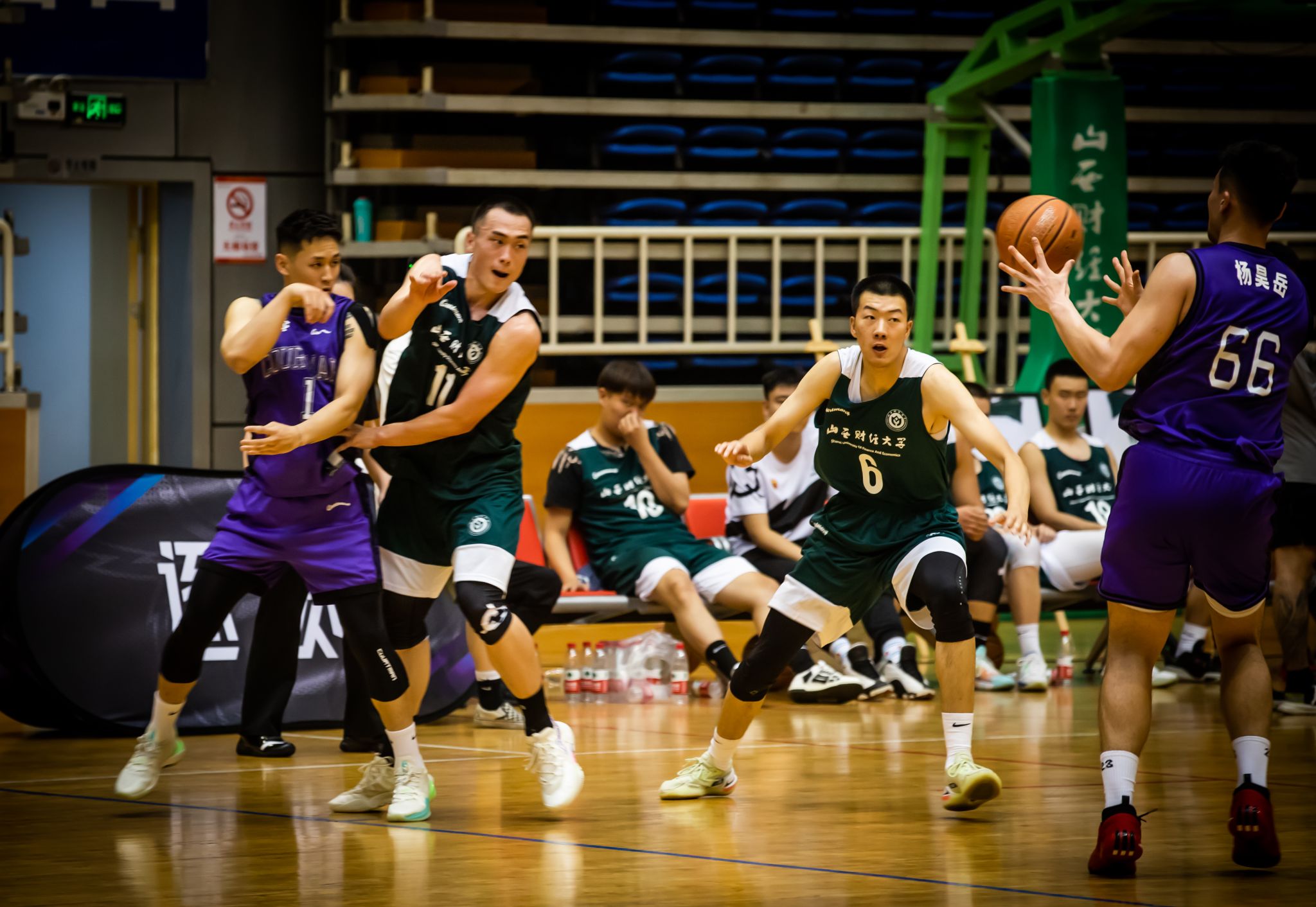 第二节开始,山西财经大学篮球队调整战术,沉着应战,积极寻找自己的节奏,队员们分散站位,在对方队员周围观察,不错过每一个抢球的机会,在对方的猛烈攻势中寻找机会。双方都在全力以赴,场外观众掌声不断,欢呼不止。