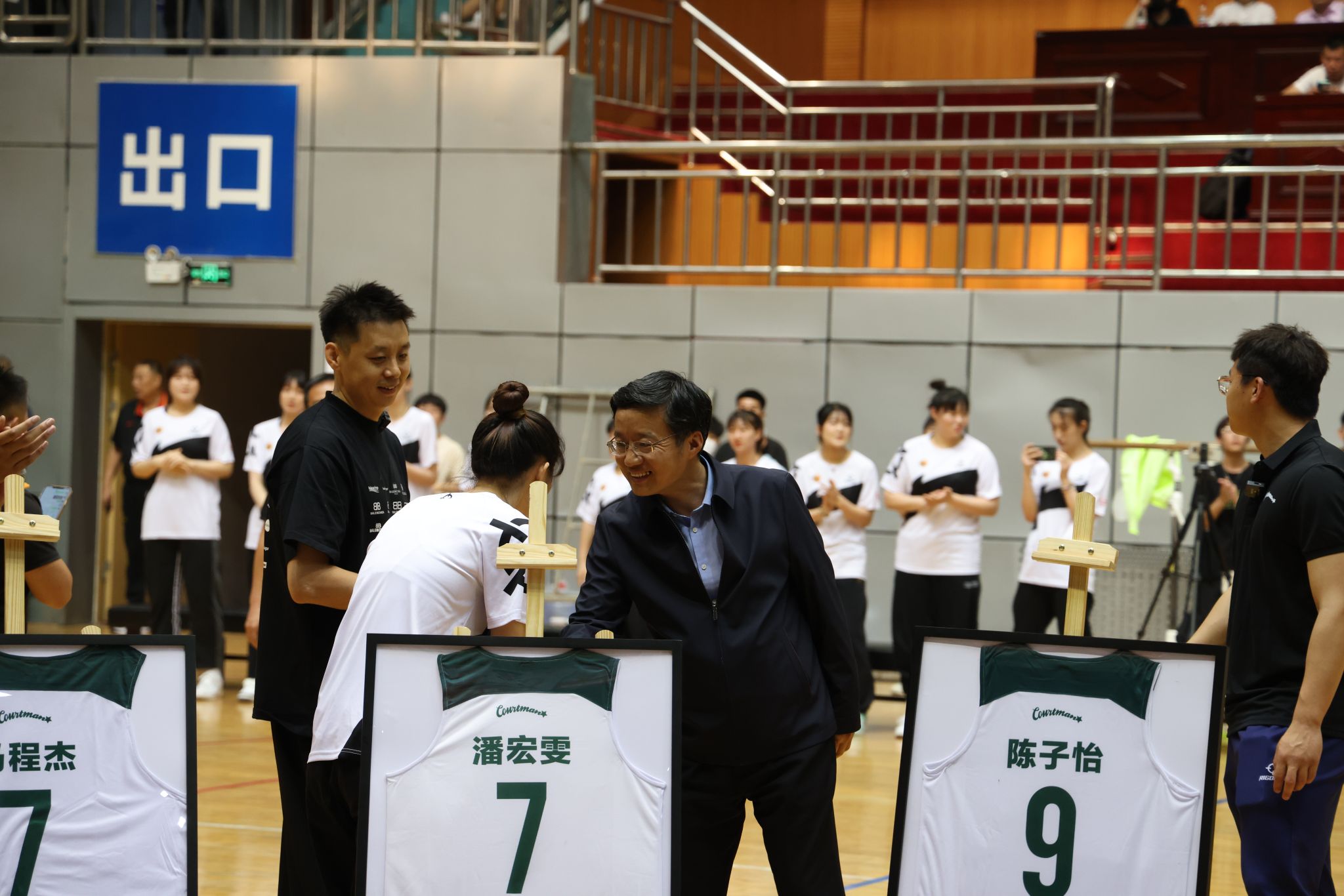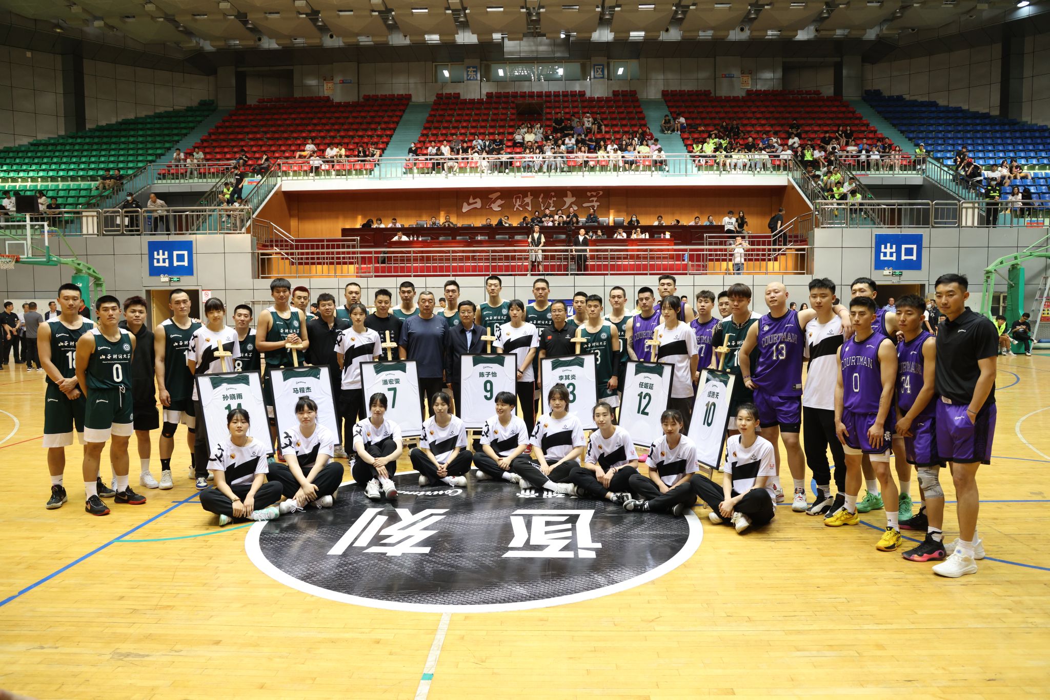 在中场期间,学校举办了一场特殊的活动——财大男女篮退役球员退役仪式,将活动气氛带入了高潮。退役球员与自己曾经的球衣合影留念,退役运动员讲述了自己曾经那段辛苦但快乐的日子,回忆着那段美好且难忘的时光;男女篮教练向一直以来默默关注和支持球队的所有师生表示衷心的感谢,并承诺一定不辜负财大师生的期盼,刻苦训练、顽强拼搏,在今后的比赛中打出财大气势、打出财大精神,全力以赴为学校争光添彩,打造财大篮球品牌。