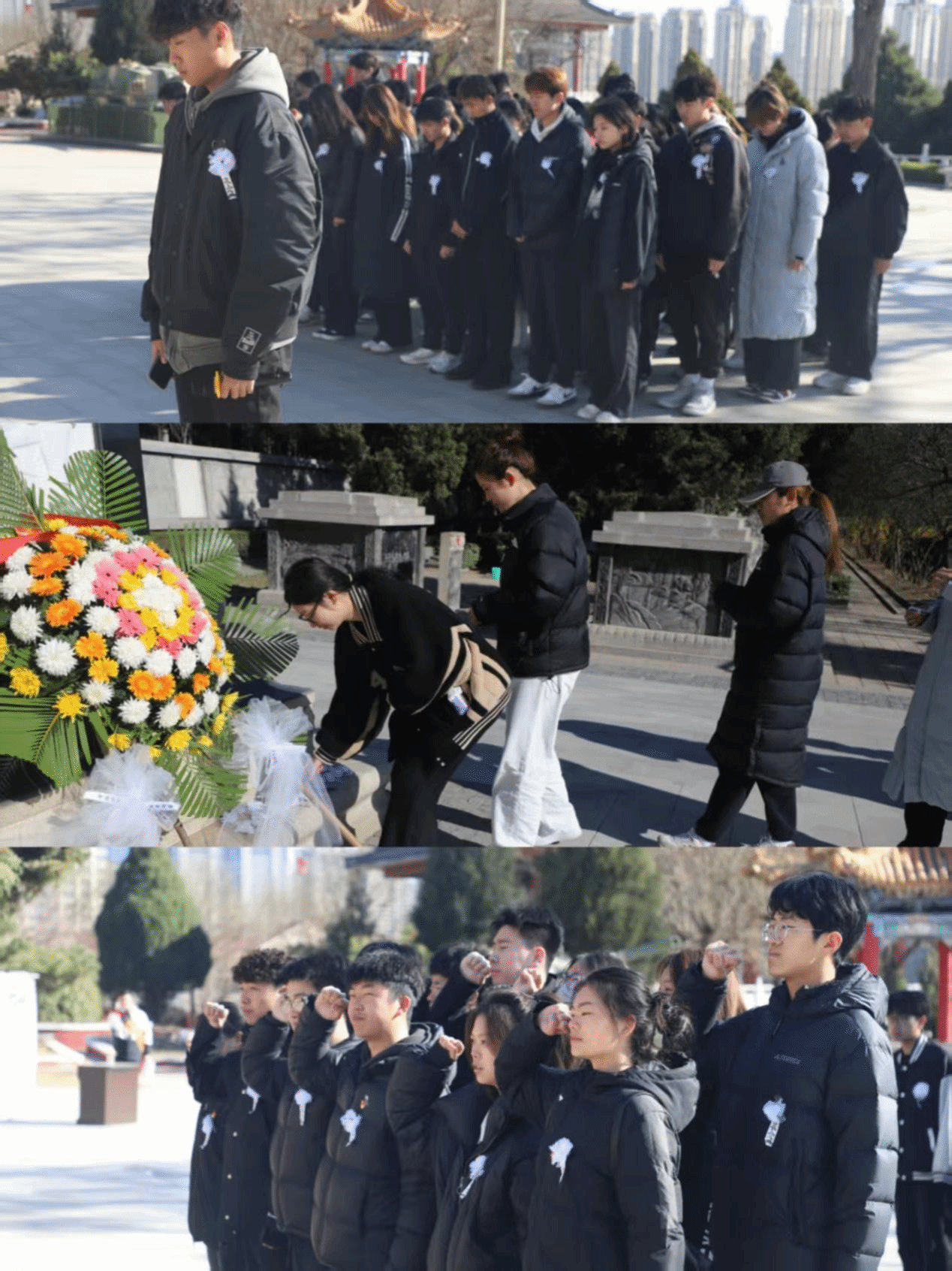 同学们在庄严肃穆的烈士纪念碑前开展缅怀仪式,全体整齐列队向革命英烈默哀一分钟,向在此安息的革命英烈敬花,寄托对英烈们的深切哀思与崇高敬意。在陵园烈士墓区,同学们拿起清洁工具,在烈士墓碑前进行祭扫,寄托对先烈的哀思。全体党员在纪念碑前伫立,面向鲜红的党旗,高举右拳,重温入党誓词,表达坚守初心、勇担使命的坚定信念。