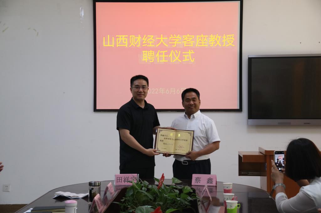 近年来坚持“开放办学”的理念给予了充分肯定,在热烈的气氛中,田祥宇校长为蔡鑫会长颁发了“山西财经大学客座教授”聘书,台下掌声不断。